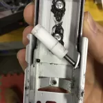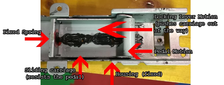 The photo below shows the metal housing for a carriage that slides back and forth, providing spring-loaded resistance to the pedal. In the photo, the lever is seen on the right because this is seen from the bottom. Note the two red dots on the housing, they’re the screws that hold the carriage to the housing (you can see the screw heads in the next photo below).
