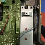 I removed all of the screws from the circuit board and also those of the metal housing that covers the carriage (see photo above, it’s the only thing that looks like it.). You don’t need to remove the circuit board, but having the screws out allows you to move it just enough so that you can get the housing out. Once I did, I could see that the pin that held the carriage roller in place had come apart.